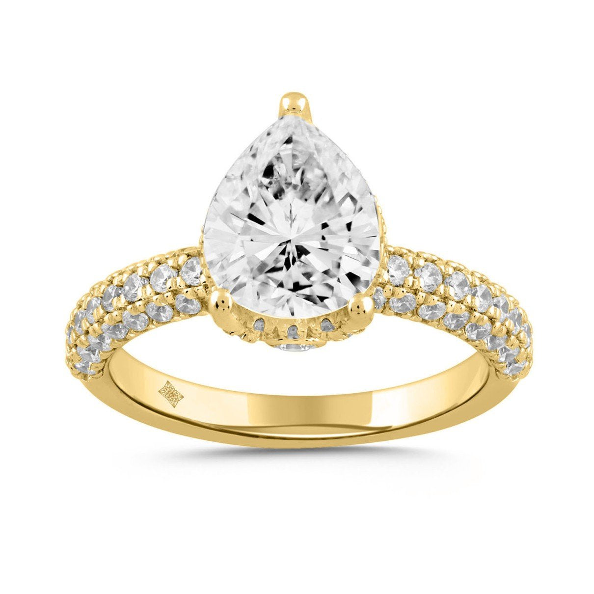 Elevate your proposal with our breathtaking 2.75 Carat Round and Pear Lab-Grown Diamond Engagement Ring, set in luxurious 14K Yellow Gold. This masterpiece features a striking 2.00 carat pear-shaped diamond as its centerpiece, surrounded by round pave-set diamonds that shimmer with G-H color and VS quality. The hidden halo design adds an unexpected twist, blending classic elegance with modern sophistication. Ideal for the eco-conscious bride, this ring offers ethical sourcing without compromising on brilliance. Its radiant yellow gold band enhances the diamonds' sparkle, making it a timeless symbol of your love. Make your engagement unforgettable with this unique and stunning ring.