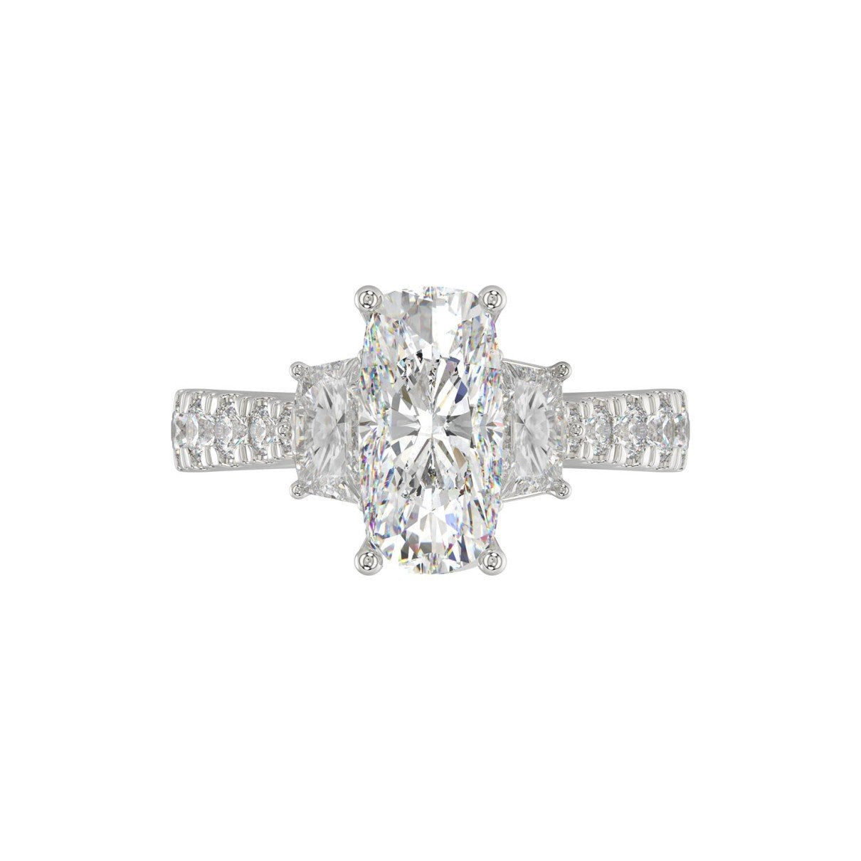 Indulge in opulence with the 3.33 Carat Cushion Diamond Three-Stone Ring from our exclusive Majesty Collection. A stunning 2.00 carat cushion-cut diamond takes center stage, flanked by exquisite round and baguette diamonds, all set in luxurious platinum. With a remarkable F-VS2 clarity and G-H color, this ring exudes unmatched brilliance and sophistication.